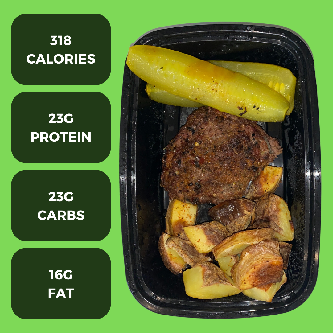 2 seasoned and grilled sliders (~ 4oz total of beef), over potatoes with a side of ketchup and pickle spear